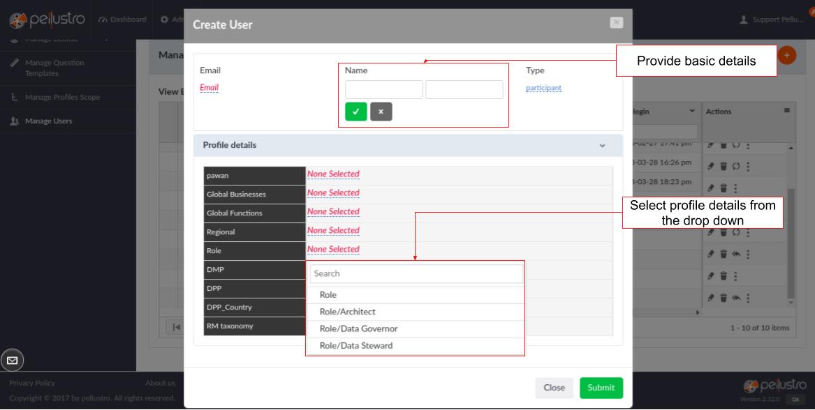 - Add Individual User: By clicking on the add individual user icon the Admin can add any individual user by providing basic details (email, name and user type) and profile details (location, role, function, and business line). Click Submit once done.
