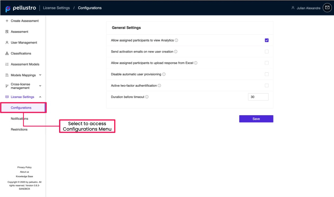 The Configurations page can be used by the Admin to change the settings of their license. A drop-down menu appears after selecting ‘License Settings’ on the Pellustro homepage.
