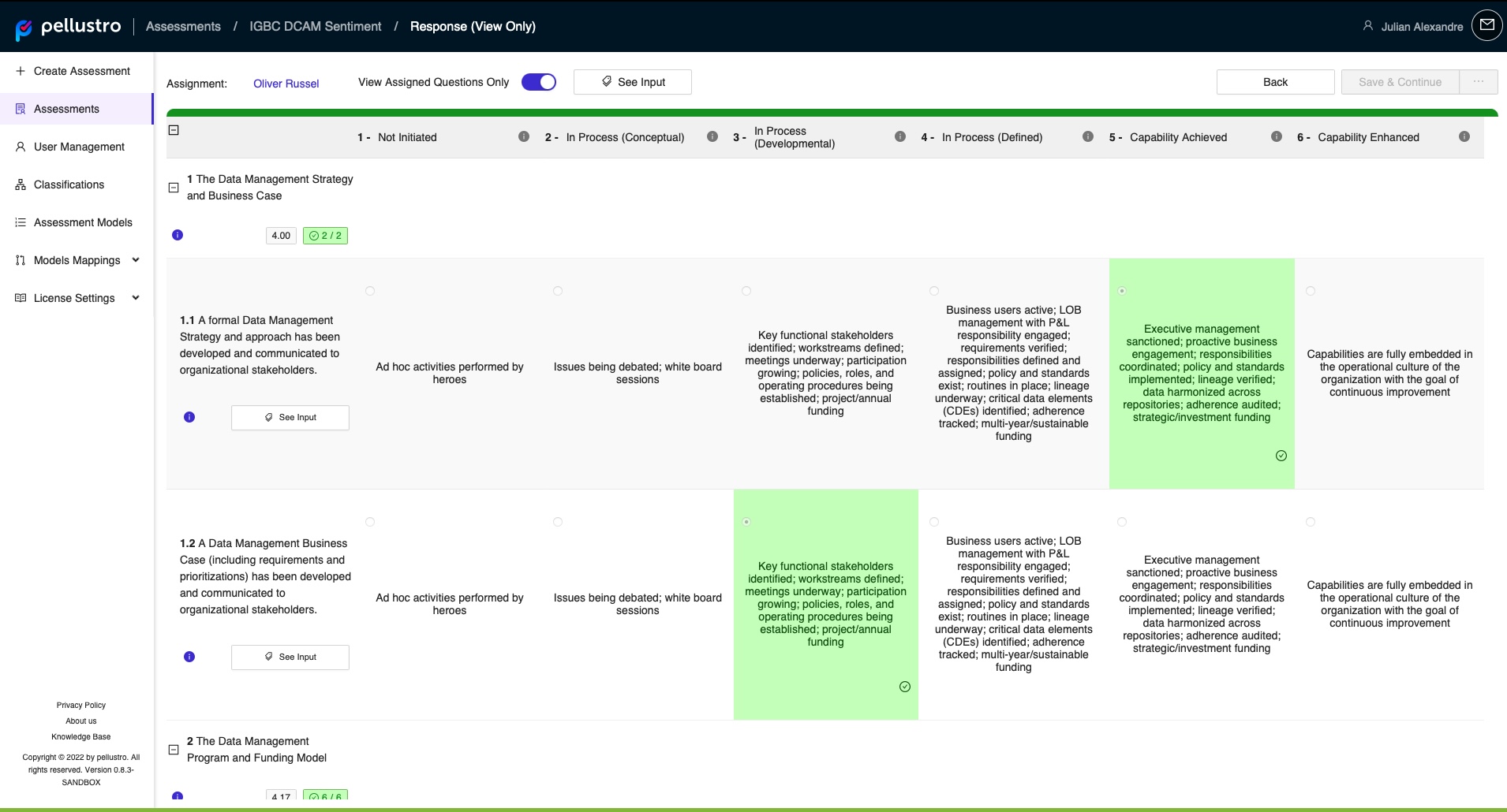 A Manager of the Assessment can view participant responses. To do so, navigate to the management assessment page, on the assignments tab find a participant that you are interested in and click the 'View Response' icon.
